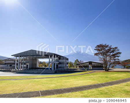 山梨県の山中湖にある野外ステージ山中湖シアターひびきと富士山,日本,