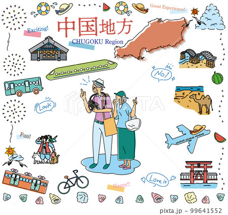 日本の中国地方の名物観光とマップ、アイコンのセット(フラット)