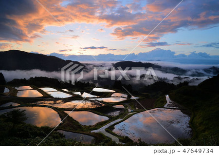 新潟県長岡市山古志 棚田養鯉池の神秘的な夜明け