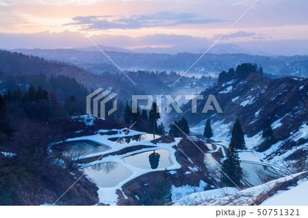 新潟県長岡市山古志 残雪の棚田と養鯉池/朝焼けに染まる霧の風景