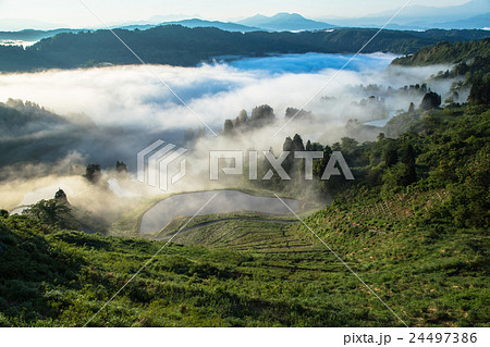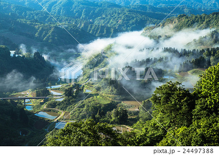 新潟県長岡市山古志 霧の湧く、棚田と養鯉池の里山