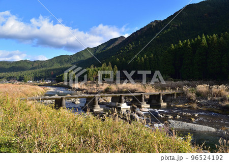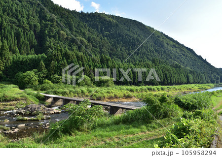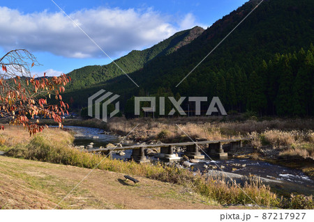 京都・京北町山国荘の大堰川の山国沈下橋と山国神社の杉木立
