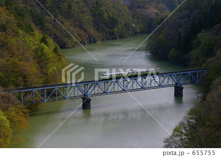 只見線「雨降る第四只見川橋梁を走る列車」紅葉背景に