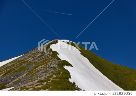 北アルプス・爺ヶ岳山頂と登山者、飛行機雲