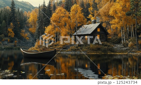 Rustic log cabin nestled among golden autumn aspens beside tranquil mountain lake, with wooden canoe at shore and warm glowing windows reflecting in still waters