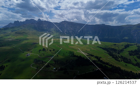 Expansive green valleys embraced by majestic mountains under a striking cloudy sky in the Dolomites region during midday light
