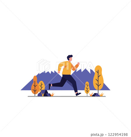 Person running in nature with trees and mountains in flat vector art style