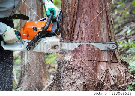 森の中でチェーンソーでひのきの大木を伐採をする山師