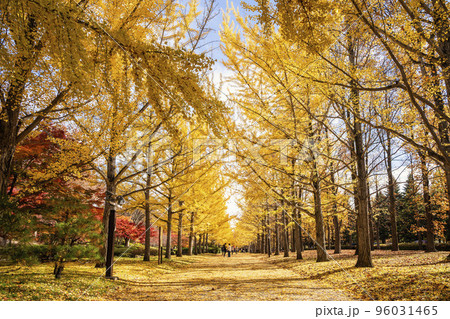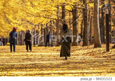 山形県総合運動公園のいちょう並木 女性の後ろ姿 山形県天童市