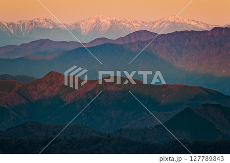 丹沢・檜洞丸から見る朝焼けの御坂山地と白峰三山