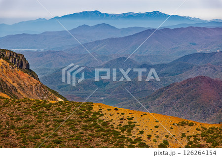 安達太良山山頂から見る紅葉の和尚山と朝もやの山並み