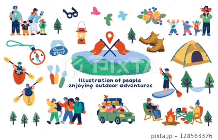 キャンプやカヤックなどアウトドアを楽しむ人々の手描きイラスト