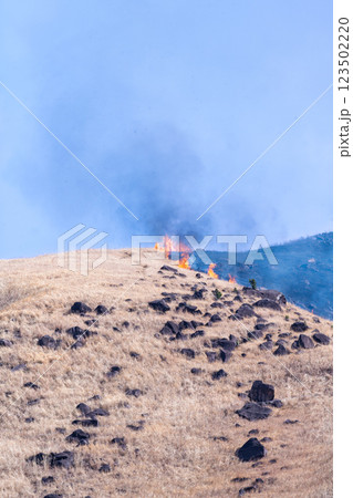 (野焼き前)春の風物詩に映える観光・行楽スポット 阿蘇の野焼き風景(俵山)