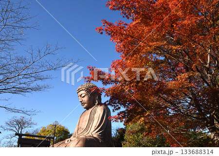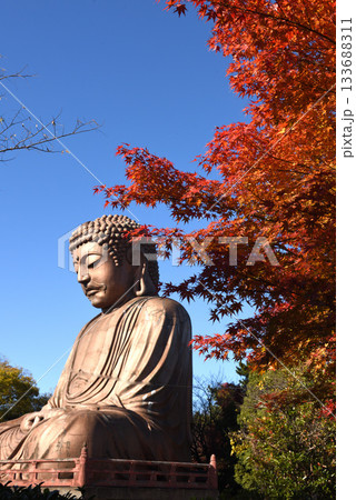 愛知県東海市 名古屋のビル群をバックにそびえ立つ聚楽園大仏
