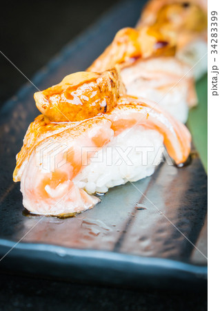 Sushi nigiri assortment with salmon, tuna and butterfish macro close up full frame