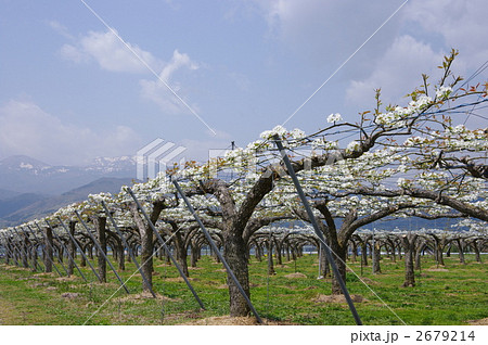 満開の桃の花と梨の花 桃と梨の花が満開の山里