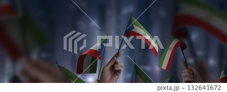 A group of people holding small flags of the Equatorial Guinea in their hands