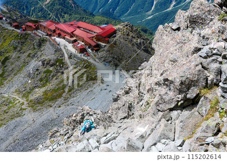 槍ヶ岳の穂先の岩場を登る女性登山者と槍ヶ岳山荘