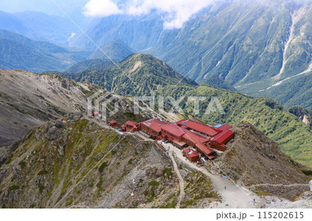 北アルプスの槍ヶ岳の頂上から見る山小屋の槍ヶ岳山荘