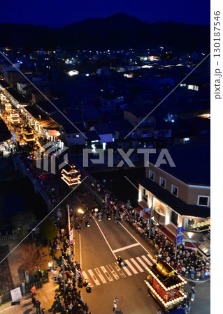 日本の岐阜県の高山市 春の高山祭の夜祭 日没後に巡行する提灯屋台 街並みの俯瞰写真
