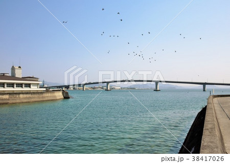広島の佐伯区の五日市楽々園にある岡の下川から見る広島はつかいち大橋 鳥あり