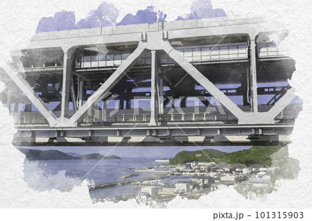 水彩画風 瀬戸大橋と下津井漁港 岡山県倉敷市