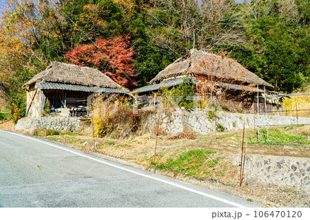 初冬の八塔寺ふるさと村 茅葺き屋根の家と納屋 岡山県備前市吉永町
