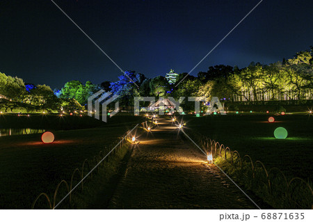 岡山後楽園幻想庭園を岡山城をバックに色とりどりのライトを見ながらの散歩道