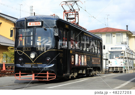 岡山市の東山おかでんチャギントミュージアム駅に停車する路面電車