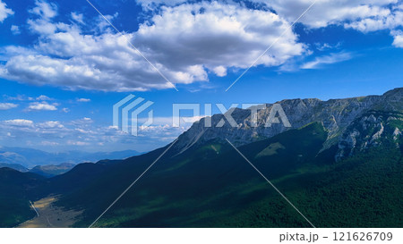 Amazing aerial drone view of Crno Jezero or Black lake, pine forest and cliffs in Durmitor national park, Zabljak, Montenegro. Travel, environment, beauty in nature, relaxing. UNESCO World Heritage