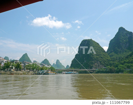 在中國桂林坐船到陽朔拍攝兩岸美麗的山景與船隻