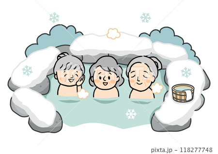 冬の露天風呂に入るシニア女性三人