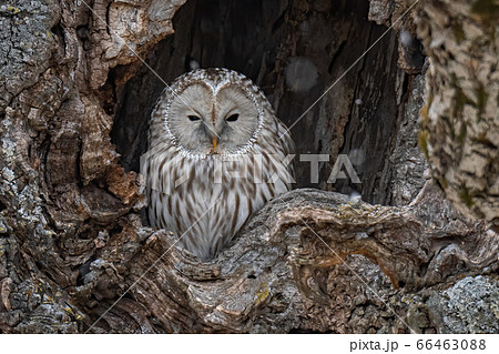 A Great Gray owl perches inside a tree-hole in Hokkaido, Japan