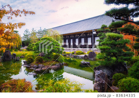 秋の京都、蓮華王院 三十三間堂の本堂と池泉回遊式庭園