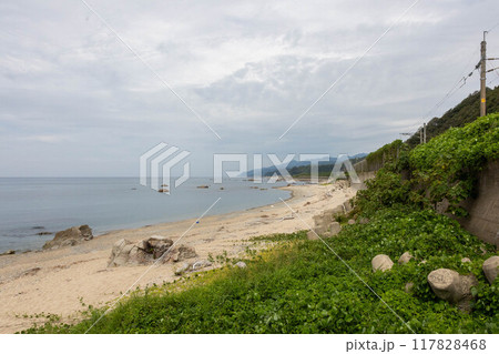 海里より村上市岩ケ崎の海岸・ビーチを望む 車窓 日本海 グルメ列車