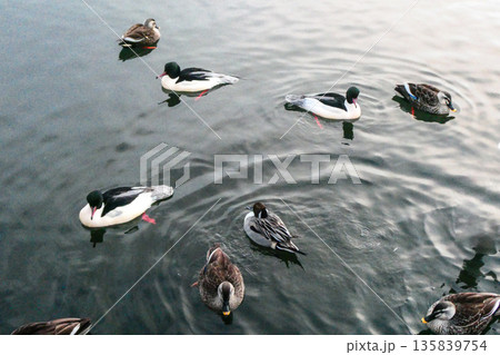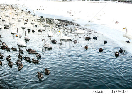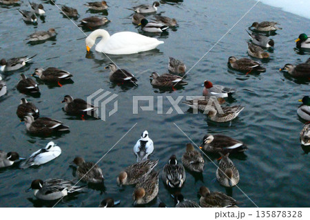 風景、自然、冬鳥、水鳥、写真 餌の争奪戦の白鳥やカモたち