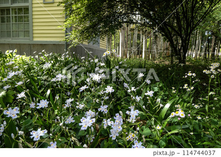 宮沢賢治の母校岩手高等農林の学舎の近くに群生する 岩手県盛岡市岩手大学のキャンパスのシャガの花の群れ