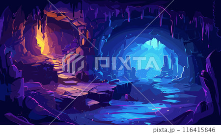 Stalagmite cave. Dark cavern inside cartoon background with stalagmites stalactites, natural limestone ceiling and floor underground stone scary caves game neat vector illustration