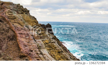 中国地方・須佐ホルンフェルス・千畳敷から、いかマルシェへの断崖を眺めるイメージ・山口県萩市須佐