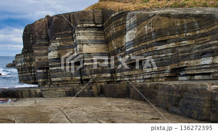 中国地方・須佐ホルンフェルス・海面から切り立った崖の高い位置にある千畳敷のイメージ・山口県萩市須佐