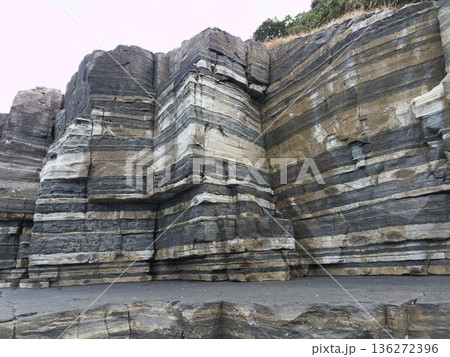 中国地方・須佐ホルンフェルス・いかマルシェから続く歩道から眺める巨大な岩の断層・山口県萩市須佐(1)