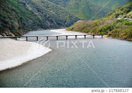 川面にさざ波立つ冬の四万十川と岩間沈下橋の風景 Ver1