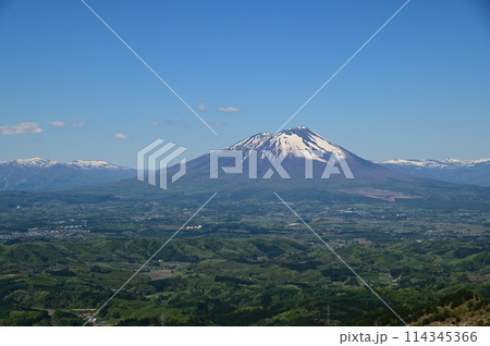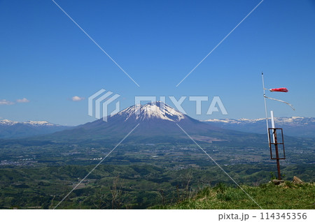 岩手県山の春 雪が溶けた牧草地に岩手山がイワワシの雪型を出して山桜が咲き誇る雪国の春
