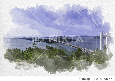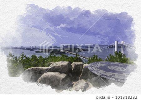 水彩画風 鷲羽山山頂からの瀬戸大橋の眺望 岡山県倉敷市