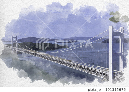 水彩画風 瀬戸大橋 下津井瀬戸大橋 岡山県倉敷市