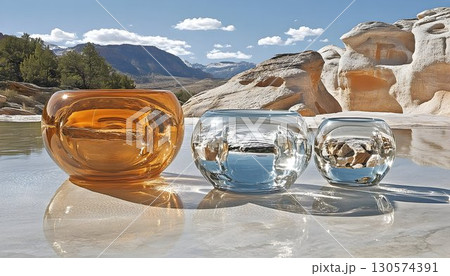 Reflective Glass Spheres Landscape: Desert Rocks and Mountain Re