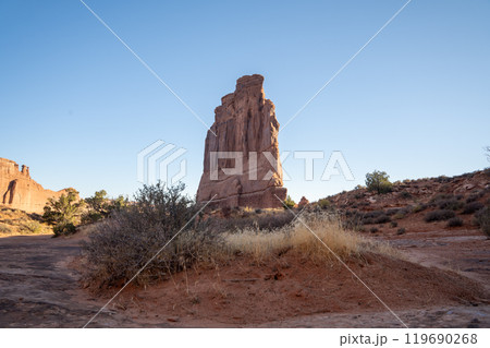 A low-angle view of the Courthouse Towers red rocks in Arches National Park.