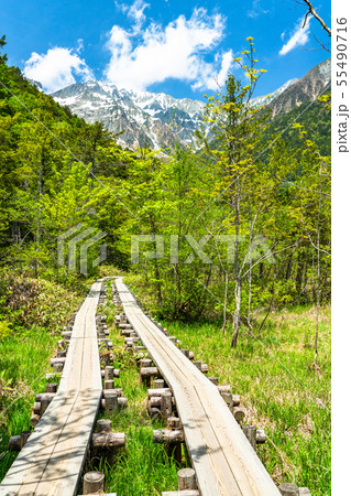 新緑の上高地 岳沢湿原付近の木道