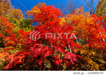 埼玉県秩父市中津川 奥秩父の紅葉の名所中津峡 真っ赤に色付いた持桶の女郎もみじと渓流の流れ