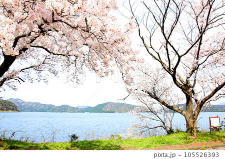 水月湖 桜と水月湖 桜と三方五湖 三方湖 水月湖標識 三方五湖 若狭町 福井県 桜 春景色